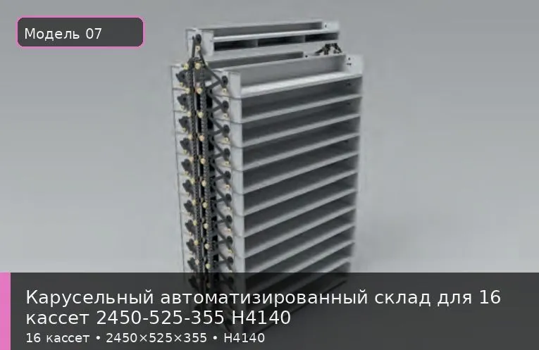 Универсальный вертикальный склад среднего класса с кассетами увеличенной высоты (355 мм), обеспечивающий оптимальный баланс между вместимостью и высотой установки. Система на 16 кассет высотой 4,14 метра подходит для большинства производственных и складских помещений со стандартной высотой потолков.