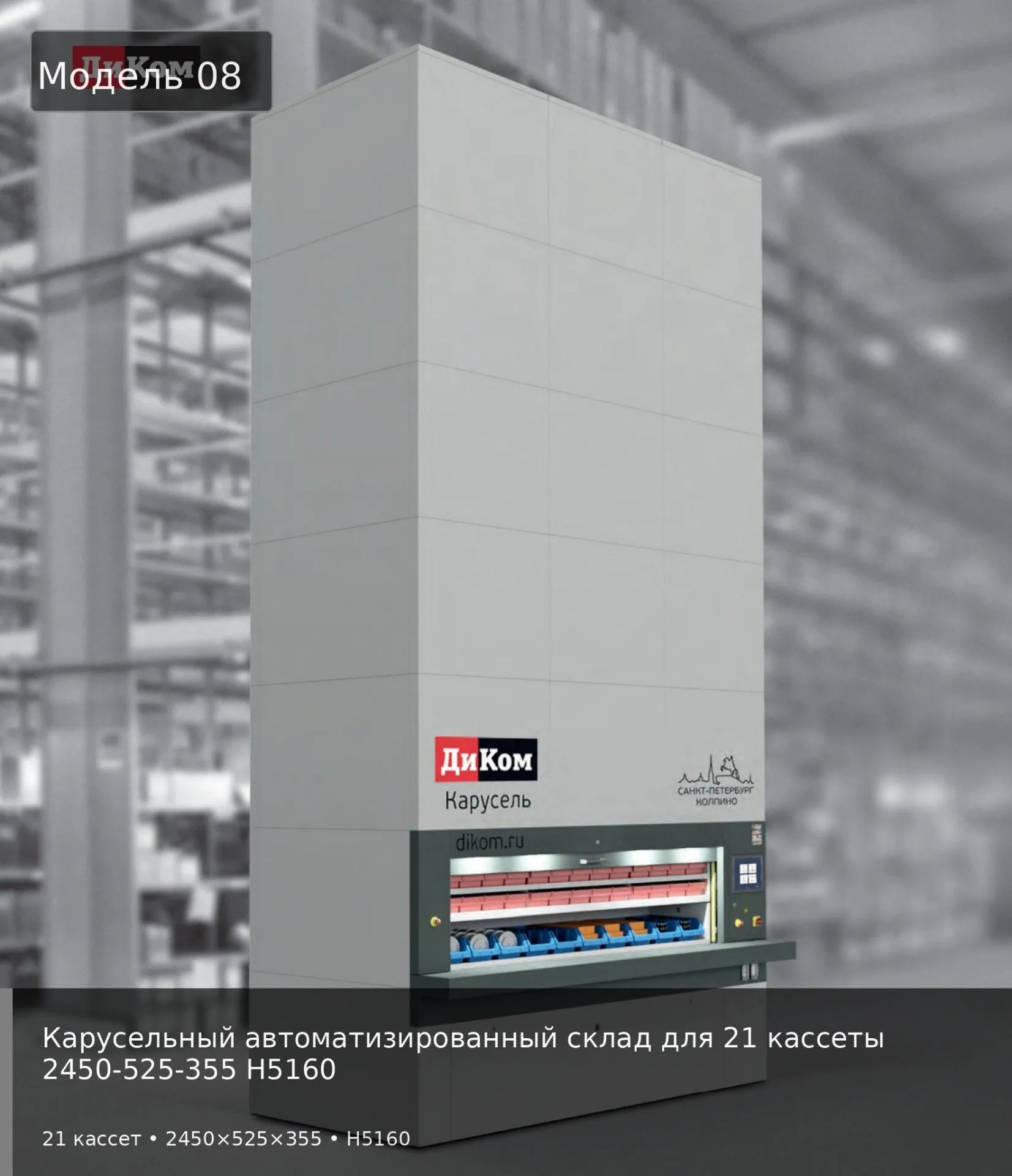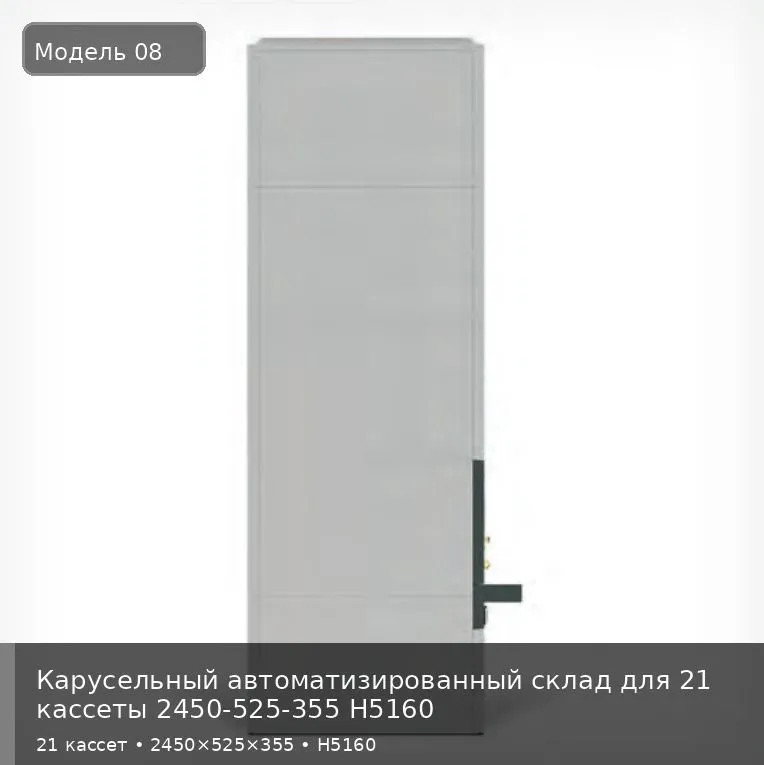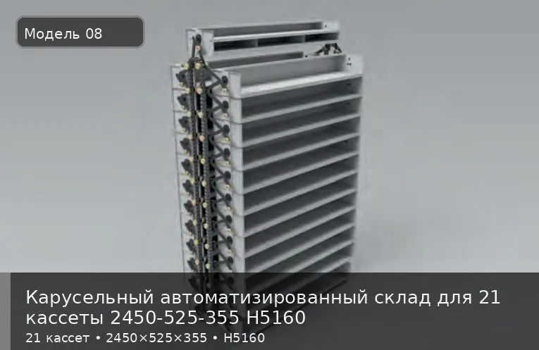 Высокопроизводительный автоматизированный склад с увеличенной высотой кассет для предприятий с интенсивным товарооборотом средне-габаритных деталей. Система на 21 кассету высотой 5,16 метра обеспечивает хранение до 18,1 м³ грузов при минимальной занимаемой площади, что в 8-10 раз эффективнее традиционного стеллажного хранения.